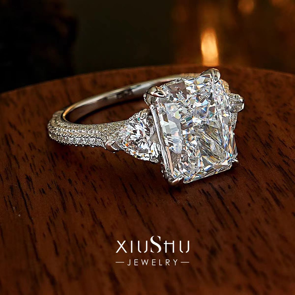 This statement three-stone ring features a breathtaking 6-carat center diamond of F color and VVS2 clarity, elegantly paired with two approximately 1-carat side stones. Set in a polished platinum band with delicate pavé-set melee diamonds, the design is both bold and timeless.